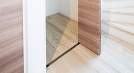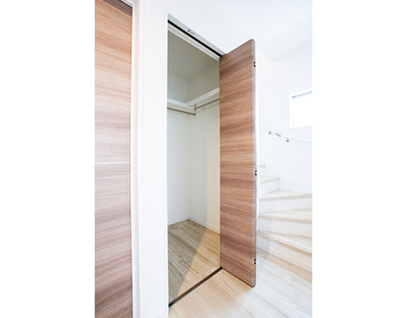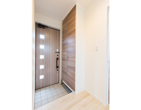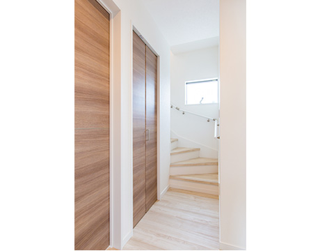 仕事から家に帰ったら着替えがすぐにでき、通勤かばんを2階まで持ち込む面倒がないよう、玄関を入ったらすぐにプライベートに切り替えられるお部屋です。