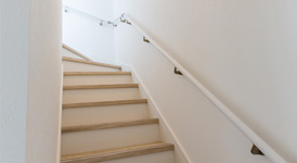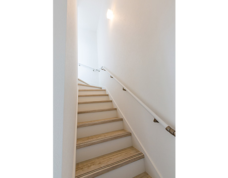 広いリビングルームから屋上へと続く階段は、開放感がある天井の高さが自慢です。リビングルームと階段の間には扉を設けて、室内の空調効果に配慮しました。屋上からの花粉やホコリを室内に入れない効果もあります。